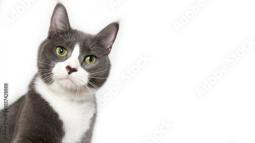 © becky, Fototapeta premium Grey and white cat on white background