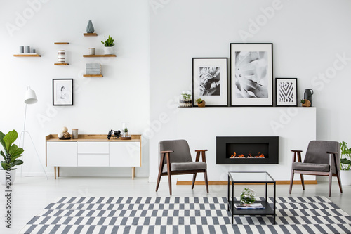 © Photographee.eu, Fototapeta premium Grey armchairs between black fireplace in spacious apartment interior with posters. Real photo