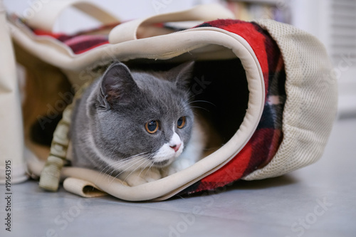 © chendongshan, Naklejka premium grey cat hiding in a bag