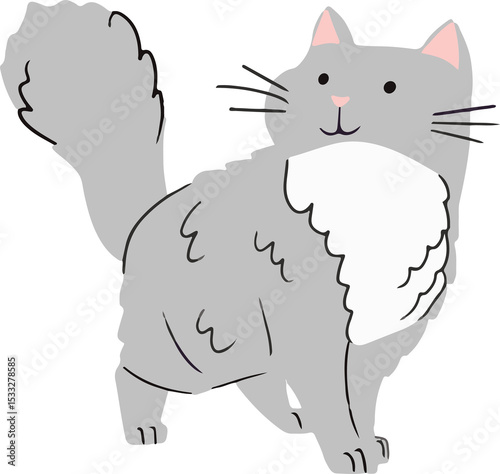 Obraz premium Grey cat is standing angled with fluffy tail in cartoon style on transparent...