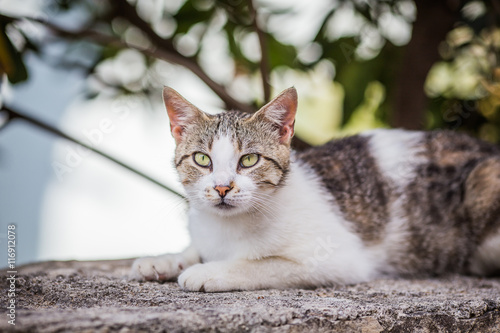 © R_Szatkowski, Fototapeta premium Grey cat lying on wall