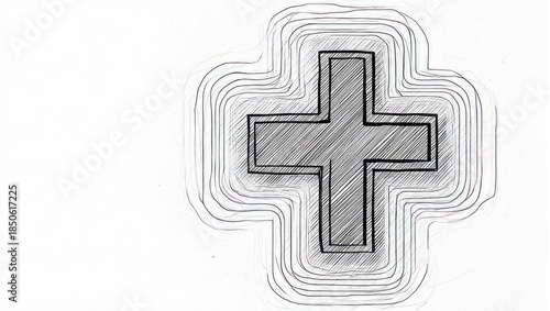 Obraz premium Grey cross symbol with radiating lines, hand-drawn sketch effect.