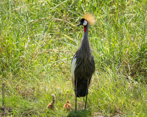 Fototapeta premium Grey Crowned Crane amd two checks feeding