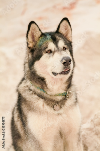 Obraz premium grey dog alaskan malamute in the hot sand desert alone