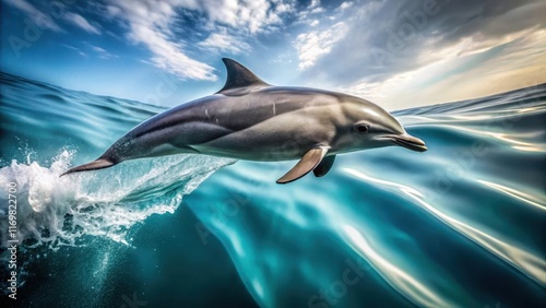 Fototapeta premium Grey dolphin swimming in ocean blue, grey dolphin, fluid motion, grey...