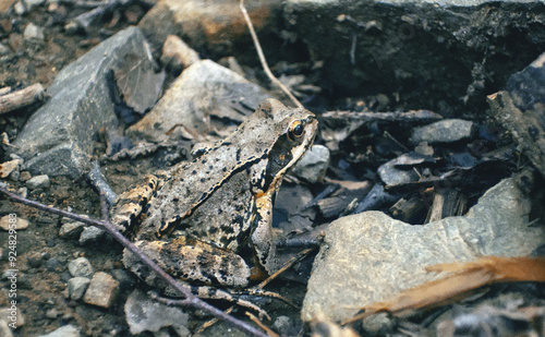 Naklejka premium Grey forest frog sitting on ground in stones close up, The common frog or grass frog (Rana temporaria) camouflaged