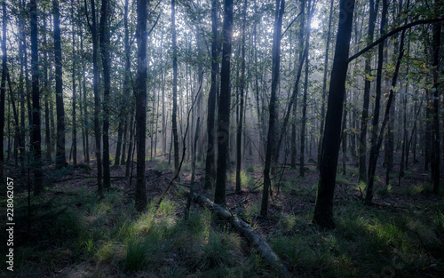 © Rik, Fototapeta premium Grey forest in the morning, light trough the trees
