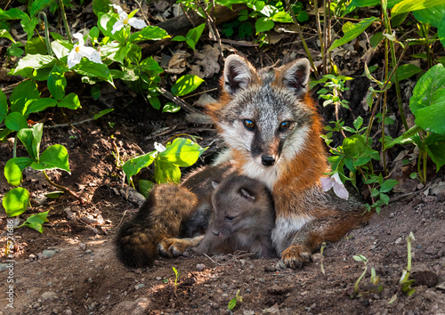 Obraz premium Grey Fox (Urocyon cinereoargenteus) Vixen and Kit Cuddle