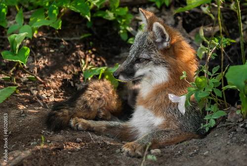 © hkuchera, Fototapeta premium Grey Fox Vixen (Urocyon cinereoargenteus) Lies in Den Entrance