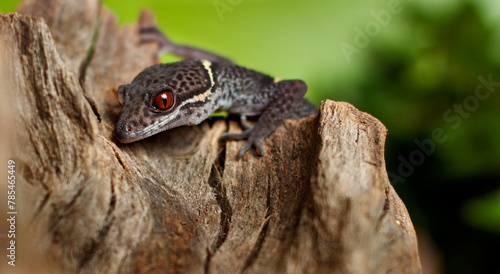 © Arkadiusz Kmera, Fototapeta premium Grey gecko with red eyes climbing on a tree. Green background.