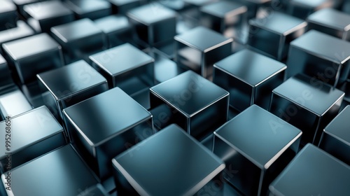 © Johannes, Naklejka premium Grey, Glossy Cubes Neatly Aligned to create a Innovative Tech Wallpaper. 3D Render.