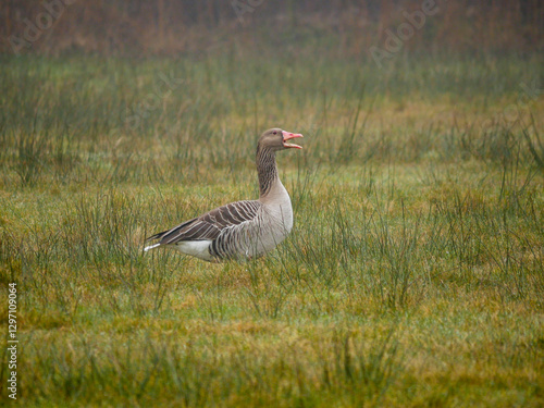 Fototapeta premium Grey Goose in marsh landscape looking for food. Bird migration. Wildlifw...