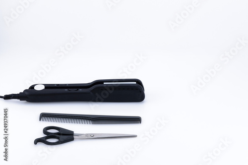 Obraz premium Grey hair iron with accessory on the white background with copy space.
