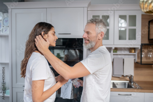 © zinkevych, Obraz premium Grey-haired man hugging his beautiful young wife
