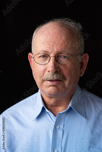 © Ranta Images, Obraz premium Grey haired senior man with mustache wearing eyeglasses against black background