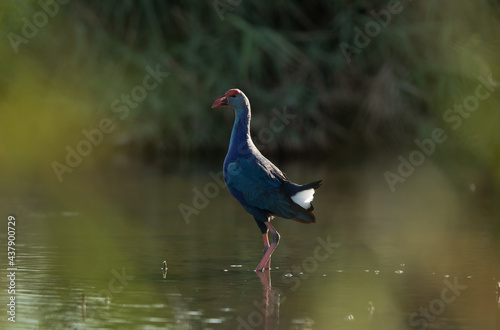 © Dr Ajay Kumar Singh, Naklejka premium Grey-headed Swamphen in its habitat at Asker Marsh, Bahrain. Framed with bokeh of reeds and grass on both side.