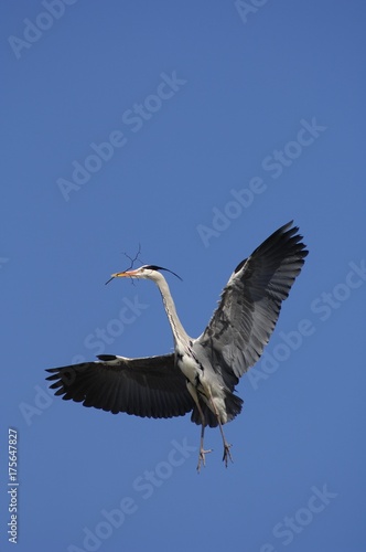 Obraz premium Grey Heron (Ardea cinerea) flying with nesting material