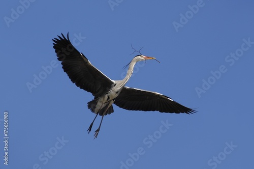 Obraz premium Grey Heron (Ardea cinerea) flying with nesting material