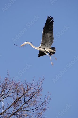 Obraz premium Grey Heron (Ardea cinerea) flying with nesting material