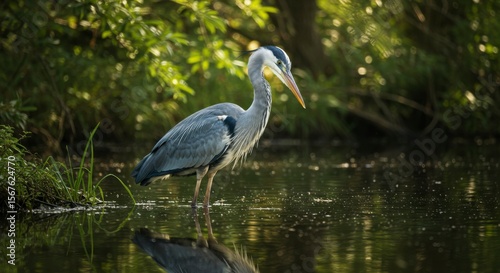 © Rex, Naklejka premium Grey heron wading in calm water, surrounded by greenery