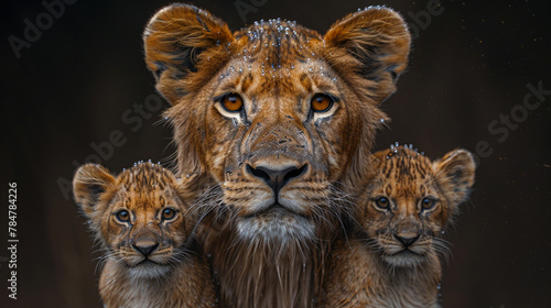 © Ume, Obraz premium Grey mother lioness and tree baby lions.