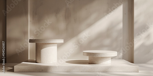 Fototapeta premium Grey pedestals in the form of round columns on a beige background for product...