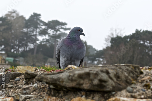© naturalearth2, Obraz premium Grey Pidgeon/ Pidgin sat on a wall with trees in the background.