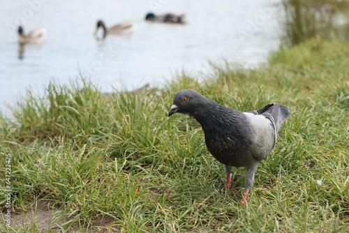 Obraz premium Grey pigeon on green grass near lake outdoors, closeup
