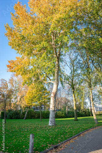 © Menyhert, Naklejka premium Grey poplar (Populus canescens) with autumn leaf colors in a park