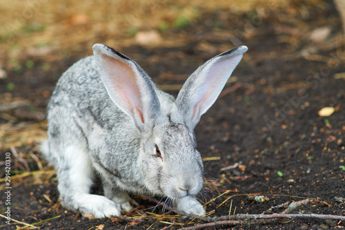 Fototapeta premium Grey rabbit breed giant sitting on the ground. Light fluffy rabbit