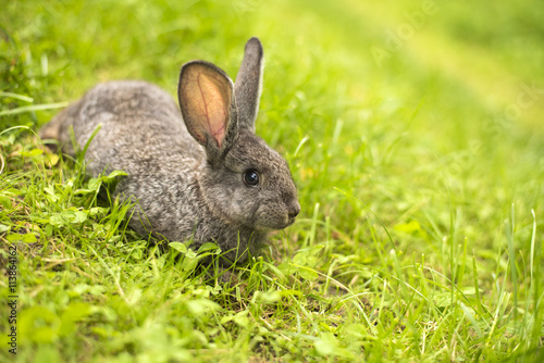 Fototapeta premium Grey rabbit in grass closeup