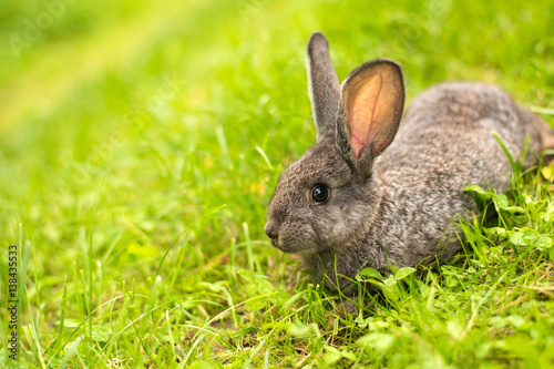 Fototapeta premium Grey rabbit in grass closeup