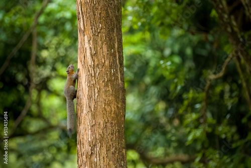 Obraz premium Grey red squirrel climbing tree trunk medium close up in Koh Yai Noi, Phuket, Thailand