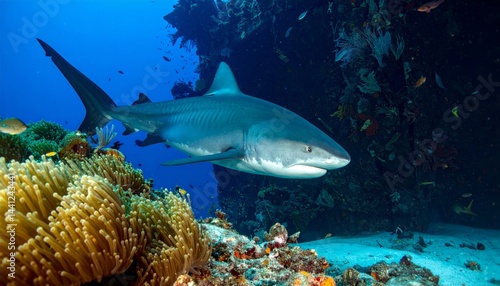 Fototapeta premium Grey Reef Shark Swimming Near Coral Reef