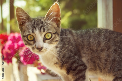 © Kolomiiets Viktoriia, Fototapeta premium grey small cat with big green and yellow eyes smells blade of grass