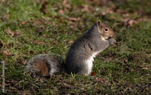 Obraz premium Grey squirrel eating in a small grass clearing.