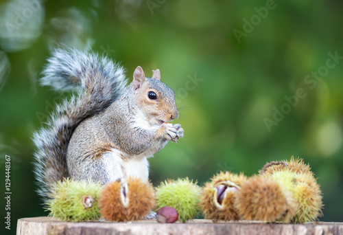 Fototapeta premium Grey squirrel eating sweet chestnut fruit in autumn
