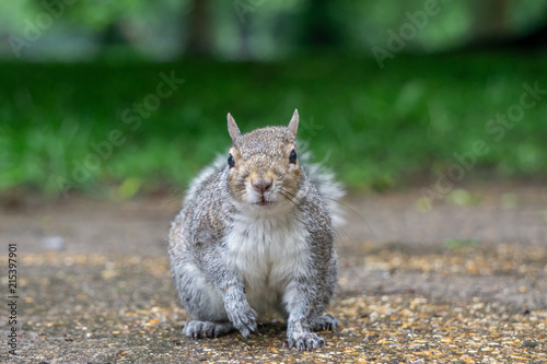 Obraz premium Grey squirrel facing camera in park with green background