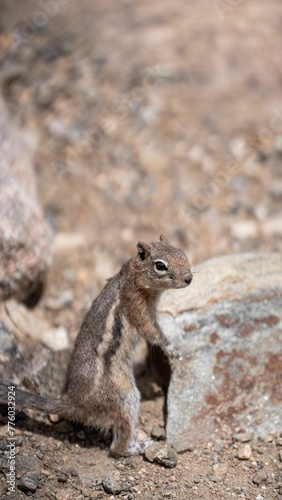 © Wirestock, Fototapeta premium Grey squirrel on a rock in the cliff