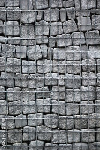Fototapeta premium Grey stones behind metal grate, abstract vertical background