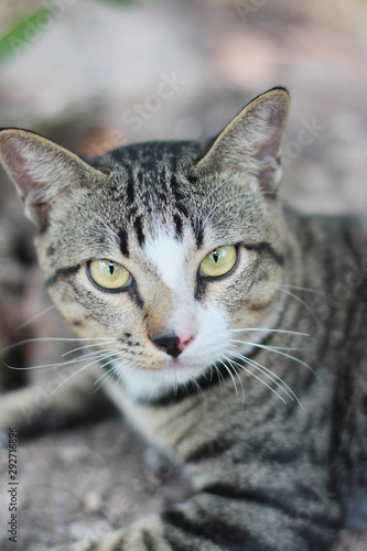 © cocorattanakorn, Fototapeta premium Grey striped cat enjoy and relax on Soil floor in garden with natural sunlight
