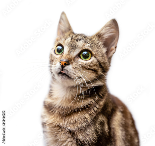 © A_Skorobogatova, Obraz premium Grey striped cat shows the tongue isolated on white background