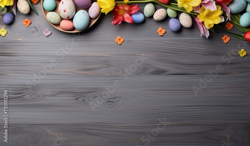 Obraz premium grey table background with coloring pencils, easter decor, flat with...