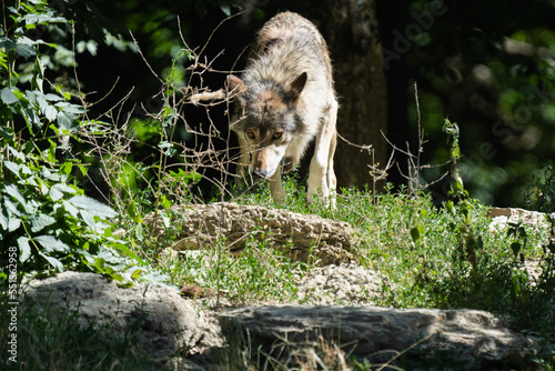 © Thorsten Spoerlein, Naklejka premium Grey timberwolf on the edge of a forest