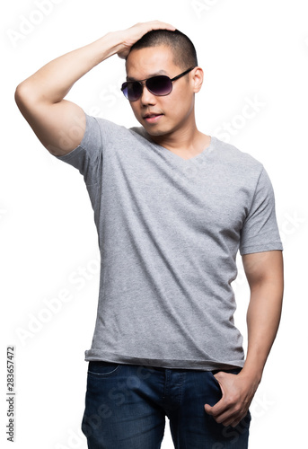 © RooftopStudioBangkok, Fototapeta premium Grey top dry on asian model for v-neck tshirt
