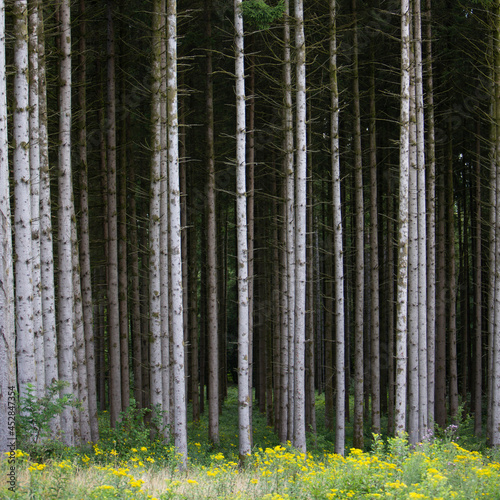 © ahavelaar, Fototapeta premium grey trunks of spruce trees and yellow summer flowers