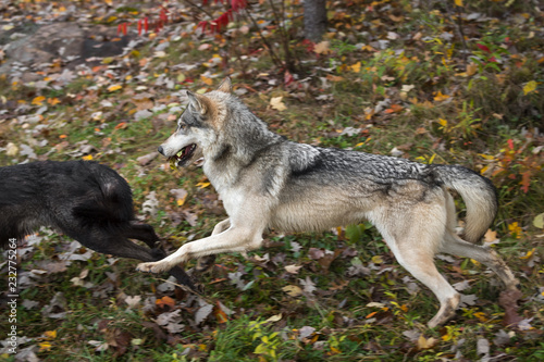 Naklejka premium Grey Wolf (Canis lupus) Chases Black With Leaves in His Mouth