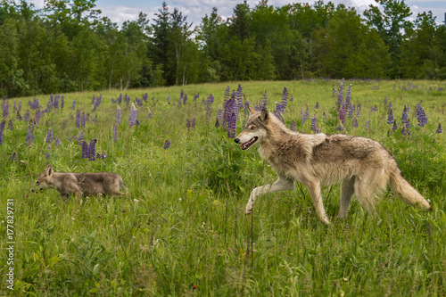 Naklejka premium Grey Wolf (Canis lupus) Follows Pup