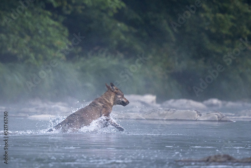 Obraz premium Grey Wolf (Canis lupus) in the river in a foggy morning, Bieszczady, Carpathians, Poland.