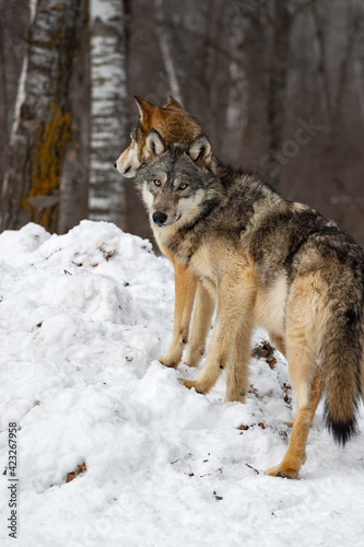 Naklejka premium Grey Wolf (Canis lupus) Looks Back While Standing on Snow Pile Winter
